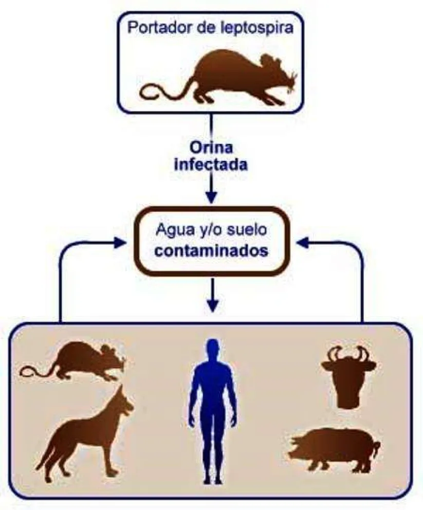 Las personas pueden contraer la infección al entrar en contacto con la orina de animales infectados. Estos animales conviven con la bacteria –muchas veces sin presentar ningún tipo de síntoma– y la eliminan por la orina. De esa manera se pueden contagiar las personas y otros animales domésticos, como perros, gatos y ganado, los que a su vez también pueden enfermar y eliminar la bacteria por la orina, convirtiéndose en una nueva fuente de contagio.