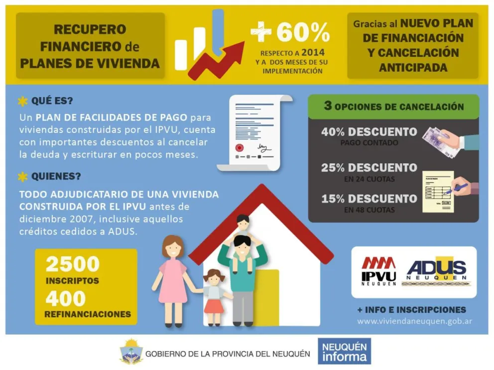 En el transcurso de dos meses y medio desde que el Instituto Provincial de Vivienda y Urbanismo (IPVU) implementara el plan de financiación y cancelación anticipada para adjudicatarios de viviendas construidas por el organismo, se registran 400 refinanciaciones y 2500 inscriptos.