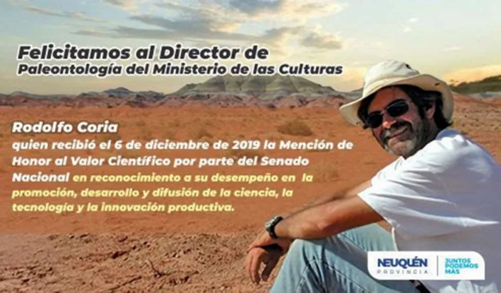 El Senado de la Nación le otorgó la mención de Honor al Valor Científico al paleontólogo neuquino Rodolfo Coria, Director del área de Paleontología del Ministerio de las Culturas de la provincia, profesor en la Universidad Nacional de Río Negro (UNRN) e investigador independiente de CONICET.