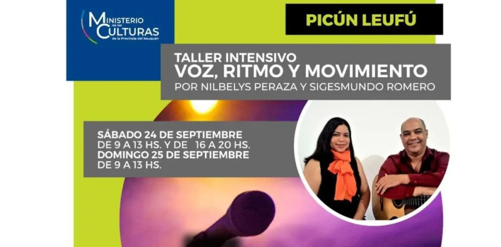 El Ministerio de las Culturas invita a la comunidad de Picún Leufú al taller intensivo “Voz, Ritmo y Movimiento”, que se realizará los días sábado 24 de septiembre de 9 a 13 y de 16 a 20 y domingo 25 de septiembre de 9 a 13 horas.