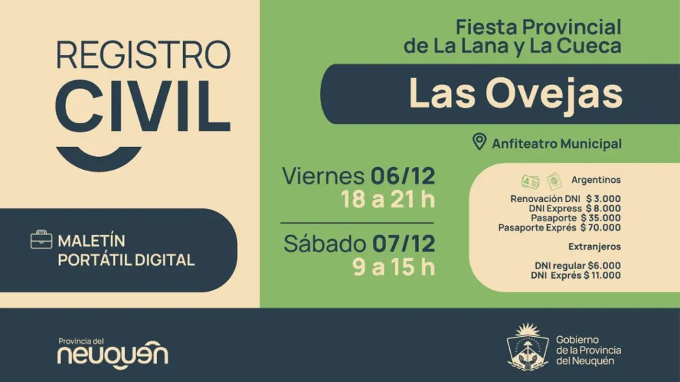 La Dirección Provincial de Registros Civiles, dependiente del Ministerio de Gobierno, confirmó su participación en la 34° Fiesta Provincial de la Lana y la Cueca que comienza este viernes en Las Ovejas. Se trata de una de las tradicionales celebraciones del departamento Minas que convoca a toda la región del Alto Neuquén.