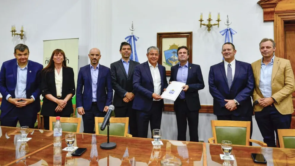 El gobernador Rolando Figueroa encabezó este lunes el acto por la firma del acuerdo de venta de ExxonMobil Exploration Argentina SRL (EMEA) a favor de Pluspetrol, mediante el cual esta firma adquiere el 100% de la tenencia accionaria de la compañía de origen estadounidense.