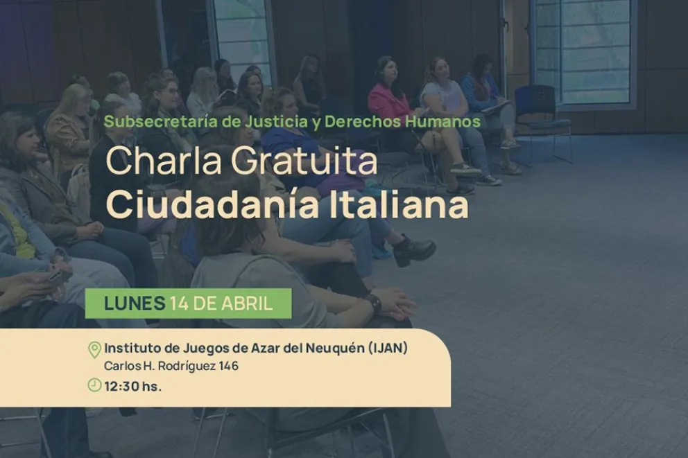 El gobierno provincial, a través de la subsecretaría de Justicia y Derechos Humanos dependiente del ministerio de Gobierno, realizará una charla informativa gratuita con cupos limitados sobre ciudadanía italiana, en la ciudad de Neuquén.