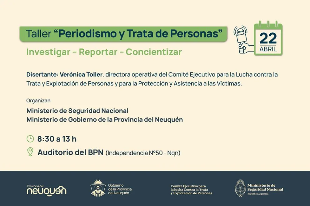 La jornada se realizará el martes 22 de abril, de 8.30 a 13 horas, en el Auditorio del BPN, ubicado en la sede central de calle Independencia en Neuquén capital, y estará a cargo de Verónica Toller, directora operativa del Comité Ejecutivo Nacional para la Lucha contra la Trata y Explotación de Personas y para la Protección y Asistencia a las Víctimas. Cuenta con la organización de la delegada de la Patagonia Norte del Comité Ejecutivo, Carolina Rambeaud, y el ministerio de Gobierno, a través del Centro de Atención a la Víctima (CAV).